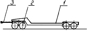 Состоит из грузовой платформы 1, опирающейся на четыре оси 2, и дышла 3.