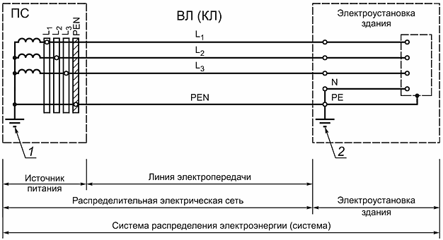 1 - заземляющее устройство источника питания; 2 - заземляющее устройство электроустановки здания; ПС - трансформаторная подстанция; ВЛ - воздушная линия электропередачи; КЛ - кабельная линия электропередачи