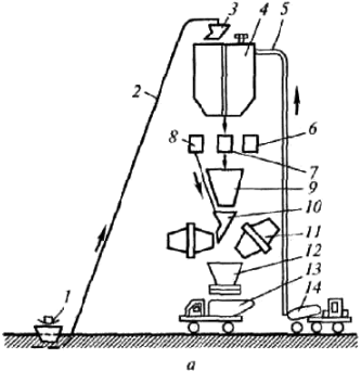 В установках башенного типа (рис.1, а) технологическое оборудование располагают по вертикали и составляющие бетонной смеси поднимают и подают в расходные бункеры один раз. Дальнейшее продвижение материалов по технологическому циклу в дозаторы, в направляющую и распределительную воронки, бетоносмеситель и далее готовой смеси в раздаточный бункер и транспортное средство осуществляется под действием силы тяжести. Такая установка отличается значительной высотой и небольшими размерами в плане.