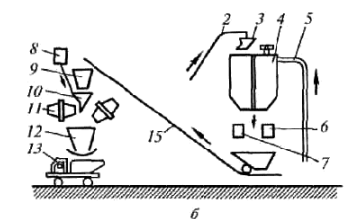 1 - конвейер склада заполнителей; 2 - конвейер подачи заполнителей в расходные бункера; 3, 9, 10 - поворотная, направляющая и распределительная воронки; 4 - расходный бункер; 5 -труба пневмоподачи цемента; 6 - дозатор цемента; 7 - дозатор заполнителя; 8 - дозатор воды; 11 - смеситель; 12 - раздаточный бункер; 13 - автобетоновоз; 14 - автоцементовоз; 15- скиповый подъемник или конвейер