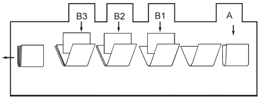 Машины, взаимодействующие, например, с рулонными печатными машинами, в которых предварительно запечатанные материалы (к примеру, проспекты или журналы) вкладываются в установленное место в другие печатные изделия (например, в газеты или журналы) (см. рисунок).