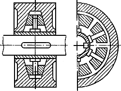 Центробежная фрикционная муфта, у которой включение и выключение происходит за счет сил трения клиновых колодок, подвижно установленных на осях внутренней полумуфты, о внутренние конические поверхности наружной полумуфты