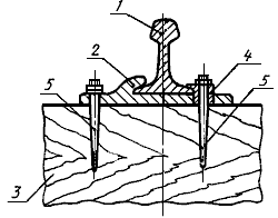 1 - рельс; 2 - подкладка полураздельного скрепления; 3 - шпала деревянная; 4 - шуруп; 5 - клемма специальная