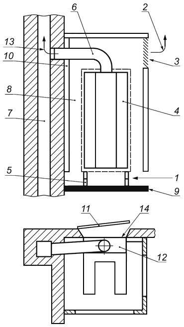 1 - приточный воздух; 2 - исходящий нагретый конвекционный воздух; 3 - расход воздуха; 4 - нагревательный элемент; 5 - опорный подшипник для нагревательного элемента; 6 - вытяжная труба; 7 - дымоход; 8 - топка (камера сгорания); 9 - пол; 10 - изоляция; 11 - передняя дверца; 12 - дефлектор; 13 - отвод продуктов сгорания; 14 - передняя панель устройства