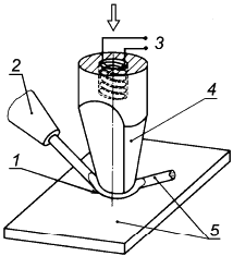 1 - сварной шов; 2 - питатель заготовки; 3 - источник питания; 4 - клинообразный инструмент; 5 - заготовка