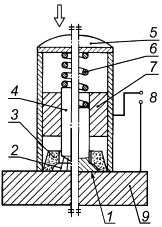 1 - сварной шов; 2 - дуга; 3 - керамическое кольцо; 4 - шпилька (заготовка); 5 - сварочный пистолет; 6 - пружина; 7 - подъемный магнит; 8 - источник питания; 9 - заготовка