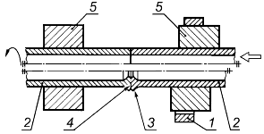 1 - тормоз; 2 - заготовка; 3 - грат; 4 - сварной шов; 5 - зажим