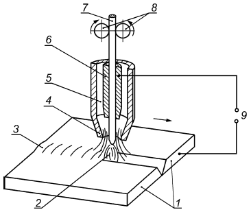 1 - заготовка; 2 - дуга; 3 - сварной шов; 4 - сопло; 5 - защитный газ; 6 - мундштук; 7 - проволочный электрод; 8 - подающие ролики; 9 - источник питания