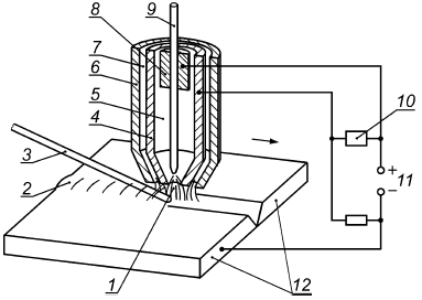 1 - дуга прямого действия; 2 - сварной шов; 3 - присадочный металл; 4 - плазмообразующее сопло; 5 - плазмообразующий газ; 6 - сопло для защитного газа; 7 - защитный газ; 8 - контактный наконечник; 9 - вольфрамовый электрод; 10 - устройство зажигания; 11 - источник питания; 12 - заготовка