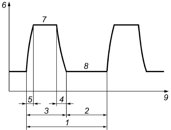 1 - период; 2 - время паузы; 3 - время импульса; 4 - время спада; 5 - время нарастания; 6 - напряжение (ток); 7 - напряжение (ток) импульса; 8 - напряжение (ток) паузы; 9 - время
