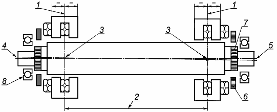1 - ось полюса статора; 2 - пролет между радиальными АМП; 3 - центр радиального АМП; 4 - центральная ось радиального АМП; 5 - ось цапфы; 6 - датчик перемещений в радиальном направлении; 7 - измерительная поверхность для датчика; 8 - страховочный подшипник