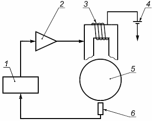 1 - контроллер; 2 - усилитель мощности; 3 - электромагнит; 4 - источник питания; 5 - ротор; 6 - датчик перемещения