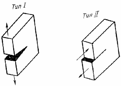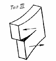 Схемы нагружения и смещений в зонах трещин. Модель типа I - трещина отрыва; модель типа II - трещина поперечного сдвига; модель типа III - трещина продольного сдвига