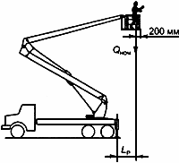 Расстояние по горизонтали от ребра опрокидывания до наружного ограждения рабочей платформы минус 200 мм
