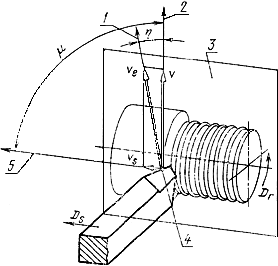 1 - направление скорости результирующего движения резания; 2 - направление скорости главного движения резания; 3 - рабочая плоскость ; 4 - рассматриваемая точка режущей кромки; 5 - направление скорости движения подачи