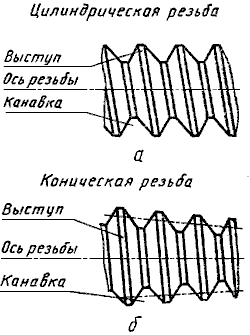 Резьба, образованная на боковой поверхности прямого кругового конуса (см. черт.3б и 4б)