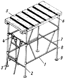 1 - секция; 2 - стойка; 3 - лестница; 4 - подвеска шарнирная; 5 - настил; 6 - скоба; 7 - связь поперечная; 8 - муфта; 9 - основание