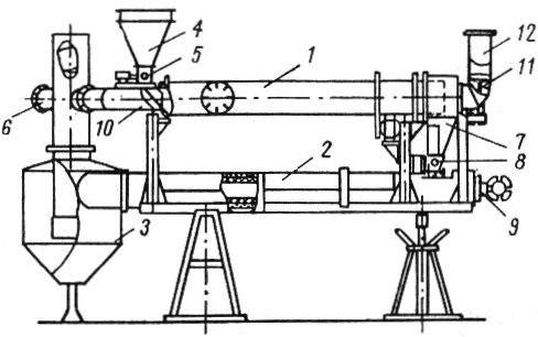 1 - сушильный барабан, 2 - трубчатая печь, 3 - циклон, 4 - загрузочный бункер, 5 - барабанный питатель, 6 - всасывающий воздухопровод, 7 - бункер для сухого сырца, 8 - барабанный питатель, 9 - форсунка, 10 - воздухопровод, 11 - вентилятор, 12 - вытяжная труба