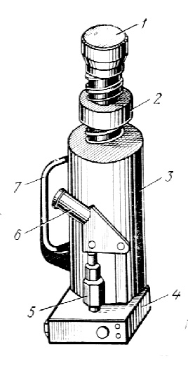 1 - пята опорная; 2 - гайка фиксирующая; 3 - корпус; 4 - резервуар; 6 - рукоятка насоса; 7 - ручка