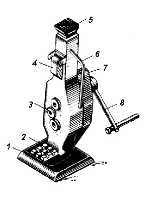1 - основание; 2 - лапа; 3 - корпус 4 - палец откидной; 5 - пята; 6 -ручка; 7 - кожух редуктора; 8 - рукоятка