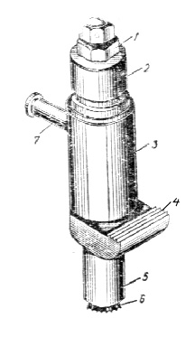 1 - гайка шестигранная; 2 - стакан; 3 - корпус; 4 - лапа; 5 - стойка упорная; 6 - подпятник; 7 - рукоятка