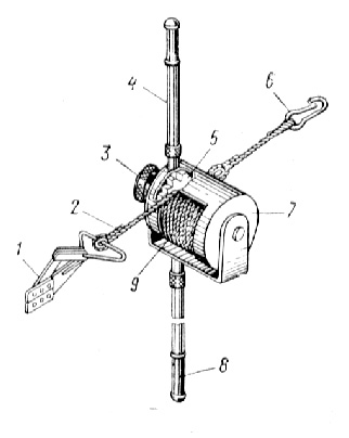 1 - захват; 2 - трос; 3 - маховик; 4 - ручка верхняя укороченная; 5 - колесо храповое; 6 - карабин; 7 - корпус; 8 - ручка нижняя удлиненная; 9 - барабан лебедки