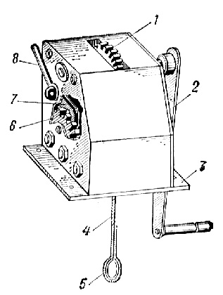 1 - венец зубчатый; 2 - ручка приводная; 3 - основание; 4 - трос; 5 - коуш; 6 - колесо храповое; 7 - собачка; 8 - ручка собачки