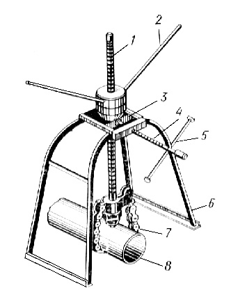 1 - винт; 2 - штурвал; 3 - каретка; 4 - винт каретки; 5 - вороток; 6 - рама; 7 - цепь; 8 - труба