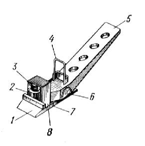 1 - подхват; 2 - втулка; 3 - палец направляющий; 4 - ручка; 5 - педаль; 6 - палец; 7 - основание; 8 - кожух