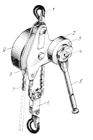 1 - верхняя подвеска с крюком; 2 - корпус тормозного устройства; 3 - корпус храпового механизма; 4 - маховичок; 5 - рукоятка; 6 - обойма с грузовым крюком; 7 - цепь пластинчатая; 8 - корпус; 9 - корпус редуктора