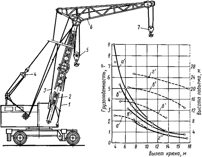 1 - ограничитель подъема стрелы; 2 - стрела; 3 - оттяжка; 4 - стреловой полиспаст; 5 - крюковая подвеска основного крюка; 6 - гусек; 7 - крюковая подвеска вспомогательного крюка