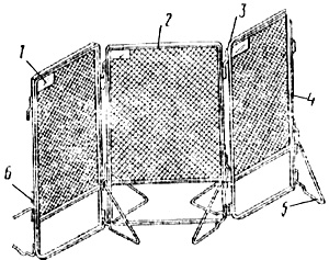 Устанавливается с целью предотвращения доступа посторонних в зону выполнения работ и обеспечения безопасности. Ограждение выполнено в виде комплекта из нескольких секций, представляющих собой сваренную из труб рамку, обтянутую металлической сеткой и снабженную откидными кронштейнами, петлями и крючками. Кронштейны в развернутом виде обеспечивают устойчивое вертикальное положение секции и ограждению в целом.