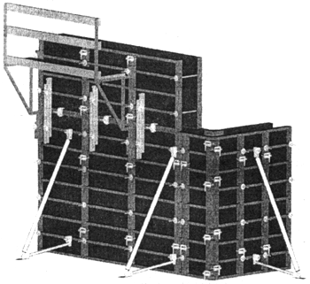 Стеновой щит - симметричный элемент, допускающий большую нагрузку, состоит из стальной рамы специального профиля и многослойной ламинированной фанеры с защищенными торцами. Стандартная высота 330, 270 и 135 см, ширина от 125 до 20 см с шагом 5 см. Масса от 29 до 130 кг. Быстродействующий замок "СООП" - это устойчивое и надежное соединение для прямолинейных элементов стеновой опалубки. Масса замка 3,89, а УНИ-замка - 5,7 кг. Замыкание и размыкание производятся ударом молотка.