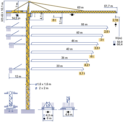 Кран предназначен для механизации строительства высотных зданий. Кран с неповоротной башней, верхним положением противовеса, нижним расположением балласта и балочной стрелой. Максимальная высота подъема груза 66,4 м, максимальный вылет - 60 м. Грузоподъемность при максимальном вылете 2,15 т, максимальная грузоподъемность - 8 т. Ходовая часть может быть выполнена в двух исполнениях: