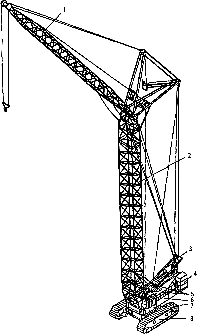 1 - управляемый гусек; 2 - башня; 3 - мачта; 4 - противовес; 5 - лебедки; 6 - поворотная платформа; 7 - кабина управления; 8 - гусеничные тележки