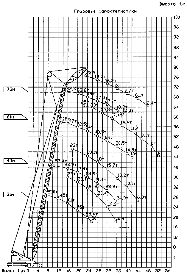 Рис.1. Грузовысотные характеристики крана МКГС-250.1 на основной стреле и гуське