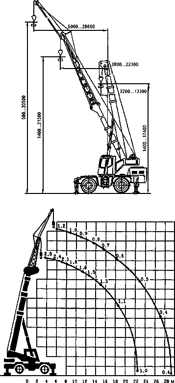 Рис.1. Кран КС-4372В и его грузовысотные характеристики на откидном гуське и надставке