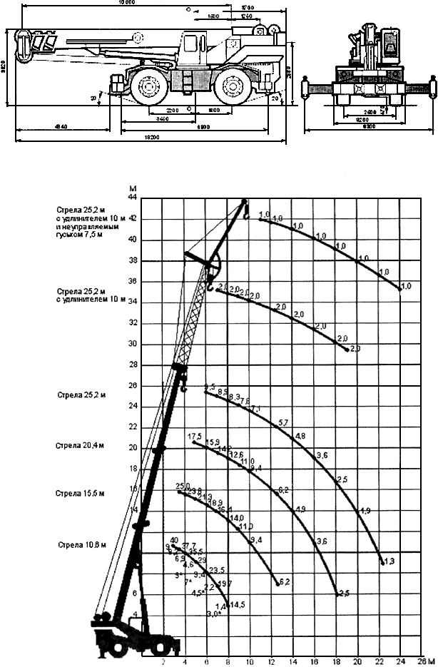 Рис.1. Общий вид крана КС-6371 в транспортном положении, на опорах и его грузовысотные характеристики