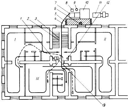 1 - розетки напряжением 36 В; 2 - стояк временного электроосвещения (с напряжением 36 и 220 В); 3 - стояк временного водопровода; 4 - шланг растворонасоса; 5 - инвентарное ограждение опасной зоны; 6 - лебедка; 7 - растворомешалка и растворонасос; 8 - ларь для алебастра; 9 - бункер для цемента; 10 - площадка для гарцовки; 11 - автосмеситель; 12 - розетки напряжением 220 В; 13 - инвентарная штукатурная емкость
