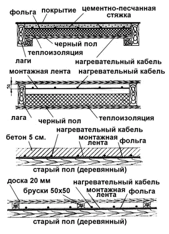 Перспективный способ отопления и обогрева гражданских зданий - теплые полы, в которых тепловыделяющим элементом служат нагревательные кабели. Наибольшее распространение получили системы фирмы "DE-VI" (Дания), предприятия "Специальные системы и технологии" (Москва), фирмы SLO (Финляндия) и другие. Варианты устройства полов с применением нагревательных кабелей представлены на рисунке 1.