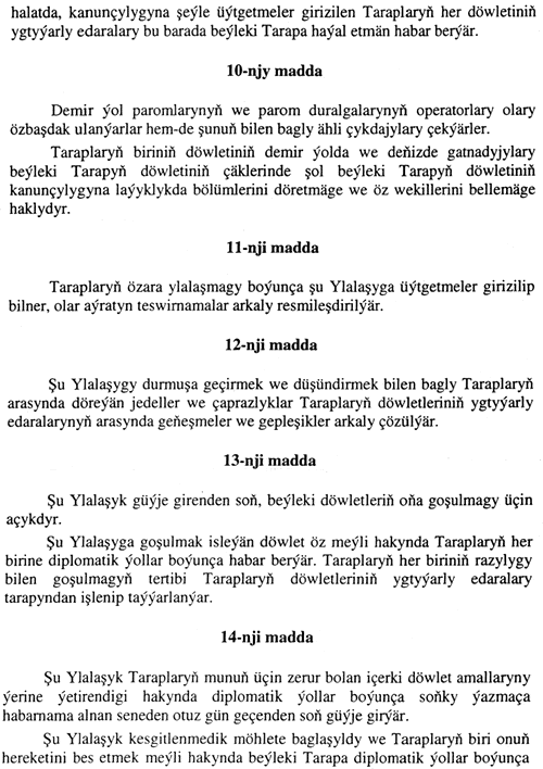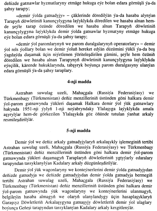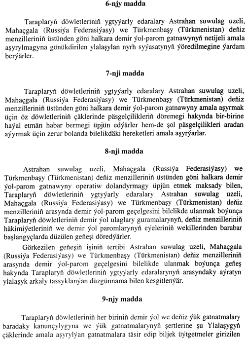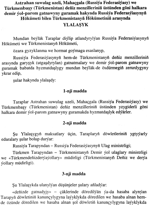 Соглашение между Правительством Российской Федерации и Правительством Туркменистана об организации прямого международного железнодорожно-паромного сообщения через порты Астраханского воднотранспортного узла, Махачкала ... (рус., туркмен.)