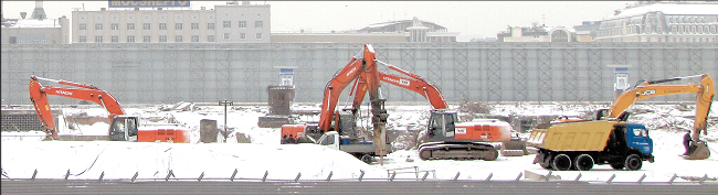 На одном из этих снимков, сделанном на днях в центре Москвы, вы видите площадку на месте старинного района Зарядье. Еще несколько лет назад здесь находилась гостиница "Россия", в которой было 3182 номера на 5300 человек, и она являлась одной из крупнейших в Европе. 1 января 2006 года отель закрыли, а 29 марта того же года начались работы по демонтажу здания. Снести гостиницу оказалось не так-то просто. Подрывать здание было нельзя из-за близости Кремля. Поэтому верхние пять этажей разобрали при помощи башенных кранов и другой техники.