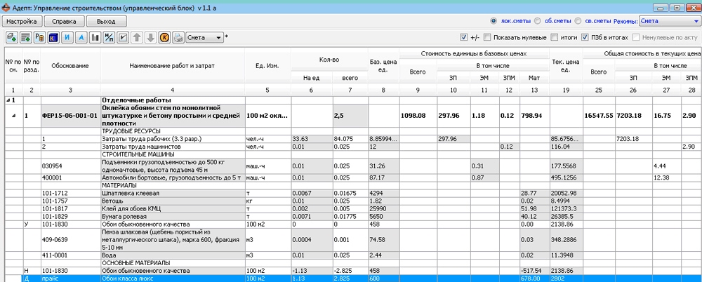 В расценках сметы можно делать любые изменения. Ресурсы можно удалять, добавлять, делать основными. Отклонения будут наглядно видны и помечены буквами. Реализован Контроллер смет на соответствие нормативам с возможностью печати отчета.