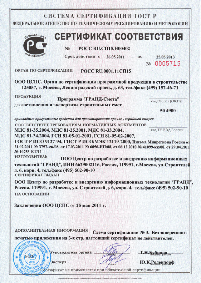 Программный комплекс «ГРАНД-Смета» версия 5.3 прошел сертификацию в системе ГОСТ Р Федерального агентства по техническому регулированию и метрологии, что подтверждается сертификатом № РОСС RU.СП15.Н00402 от 26.05.2011г. на соответствие требованиям нормативных документов, указанных в приложении к сертификату, в том числе письмам Министерства регионального развития РФ № 41099-КК/08 от 06.12.2010, № 3757-КК/08 от 21.02.2011г., № 6056-ИП/08 от 17.03.2011г., № 10753-ВТ/11 от 29.04.2011г., регламентирующим изменения требований к порядку начисления накладных расходов и сметной прибыли при составлении сметной документации.
