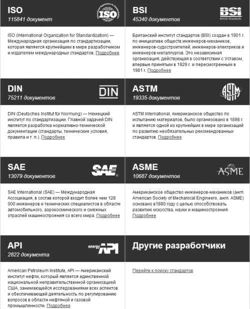 - официальная регистрация переводов зарубежных стандартов (new). Ниже приведен перечень нескольких компаний-разработчиков, стандарты которых наиболее востребованы предприятиями российской промышленности.