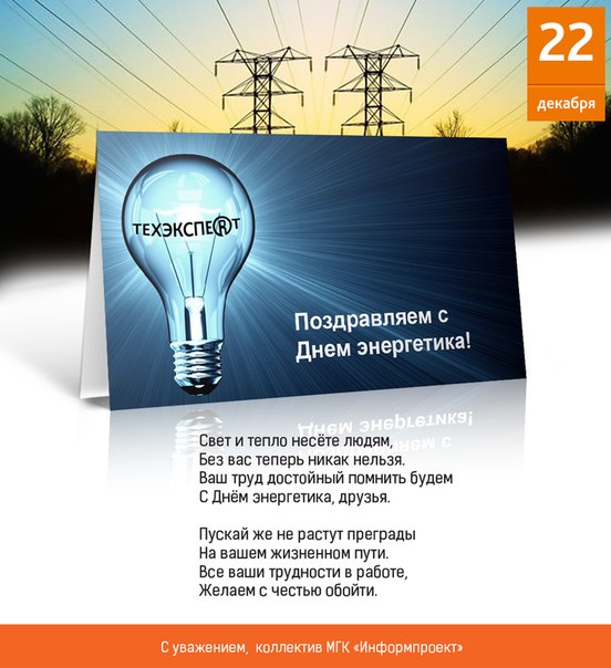 Еще сто лет назад никто не имел ни малейшего понятия, насколько прогрессивным и ярким станет мир, в котором мы сейчас живем: невероятной высоты здания, огромные заводы и предприятия, сотни тысяч километров электросетей, соединяющих города от Владивостока до Мурманска. И самое важное в этом, что нормальное функционирование всех сфер промышленности обеспечиваете вы – энергетики! Мы искренне поздравляем вас с профессиональным праздником и желаем достойно нести службу во благо процветания нашей страны, воплощения любой своей мечты и, самое главное, огромного счастья, которое будет сопровождать вас на всем жизненном пути! С праздником!