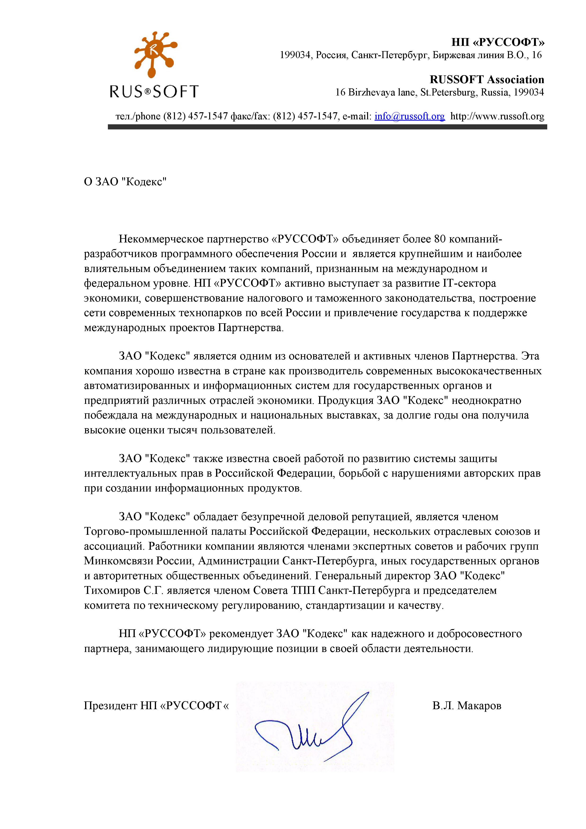 Уважаемые партнеры, пользователи и клиенты! 25 февраля 2015 года ЗАО "Кодекс", разработчик системы "Техэксперт", получил официальное рекомендательное письмо от НП "РУССОФТ". Это еще раз доказывает востребованность системы "Техэксперт" на промышленном рынке России.