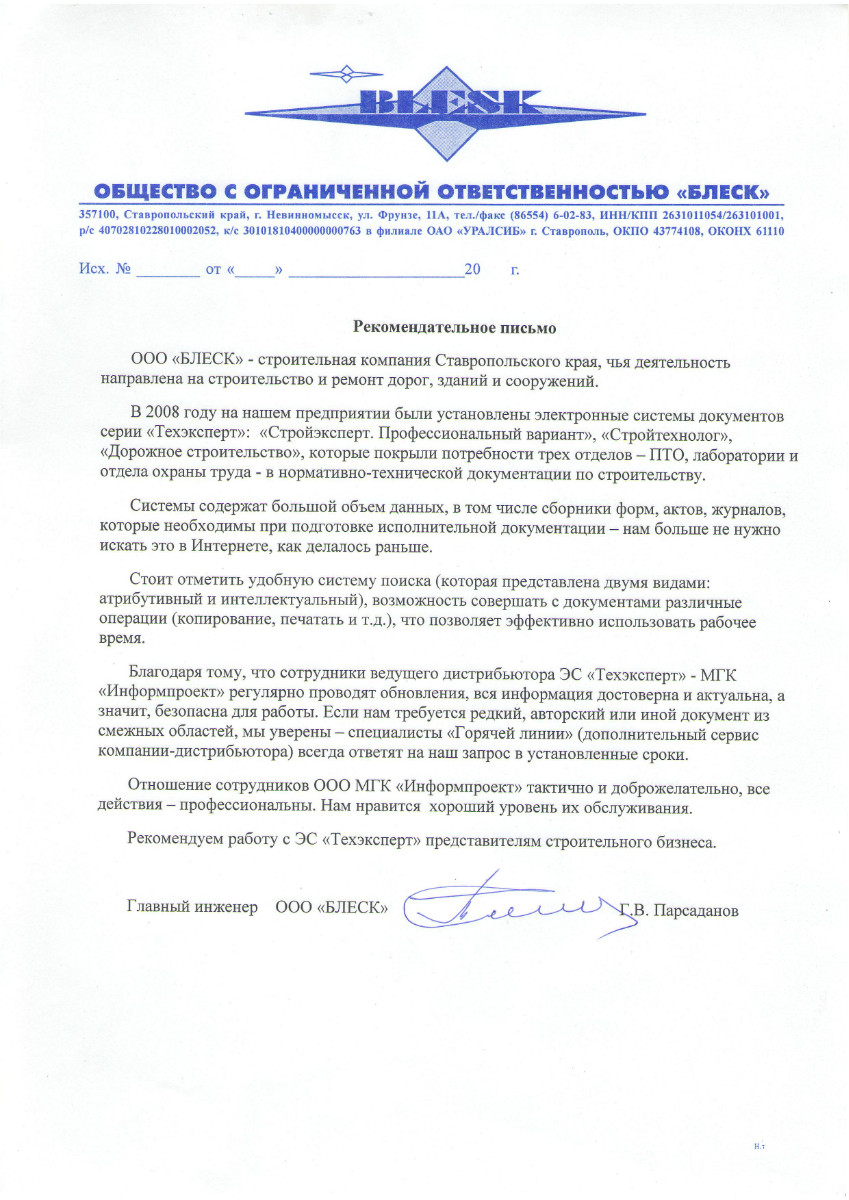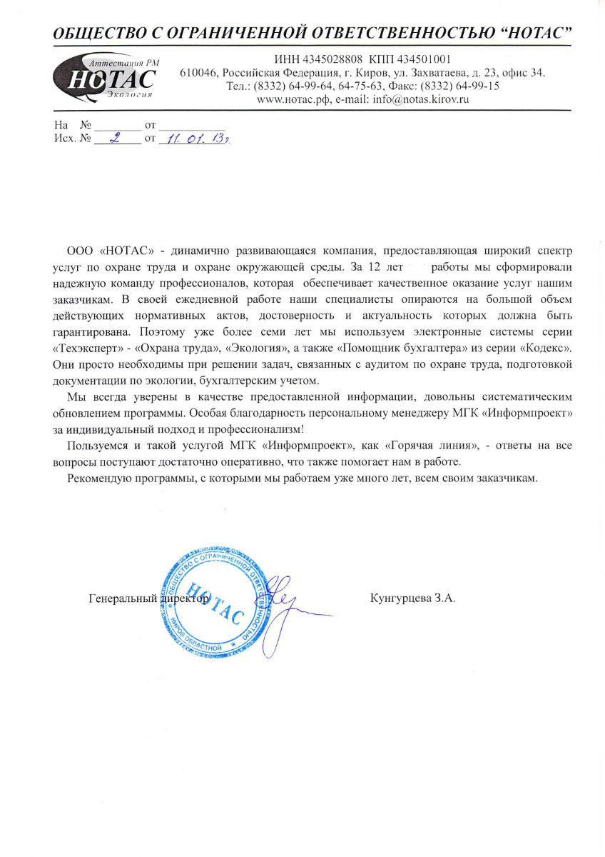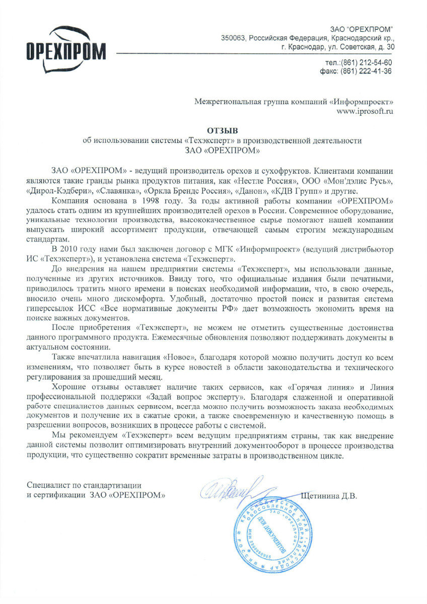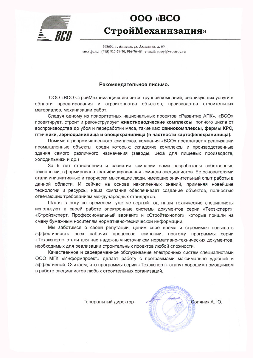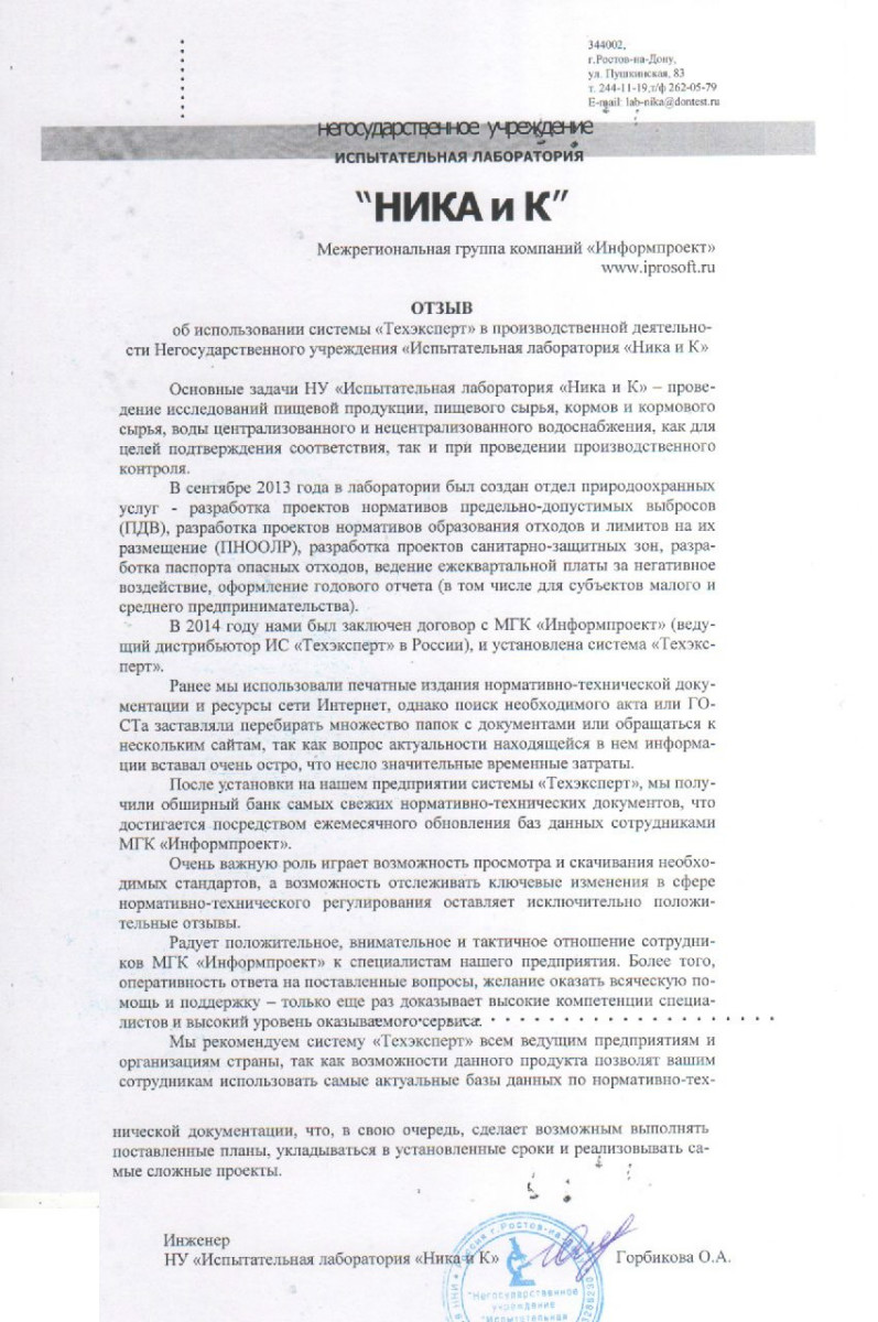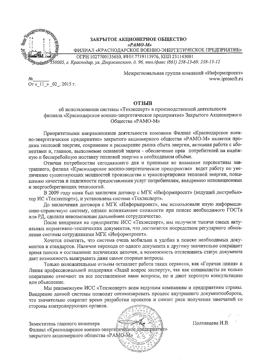 На протяжение двух лет специалисты нашей компании пользуются данной системой, которая в полном объеме покрывает потребность в нормативной документации. Поиск информации проходит удобно и быстро. В процессе работы программа регулярно обновляется, база документов поддерживается в актуальном виде. При ознакомлении с необходимым редким документом на помощь приходит сервисная услуга компании «Информпроект» - «Горячая линия».