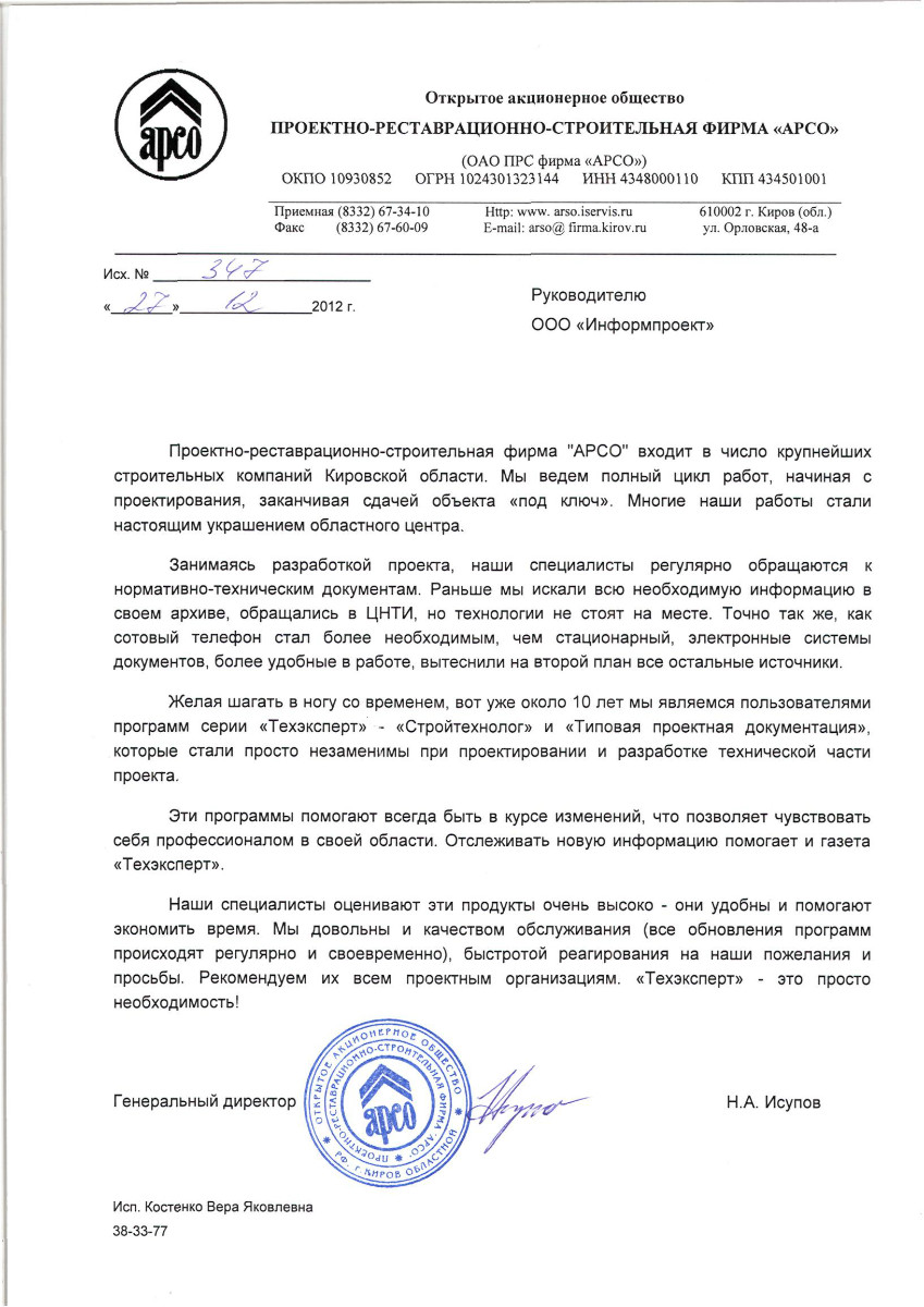 Проектно-строительная фирма «АРСО», г. Киров, генеральный директор Н.А. Исупов: