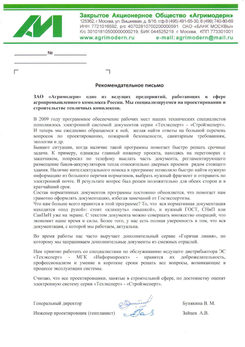 ЗАО «АГРИМОДЕРН», г. Москва, генеральный директор В.М.Бунякин